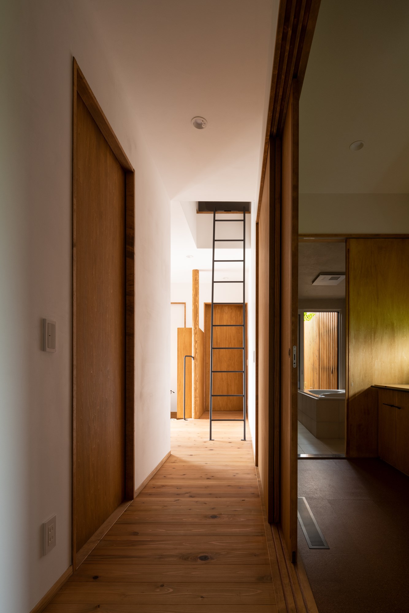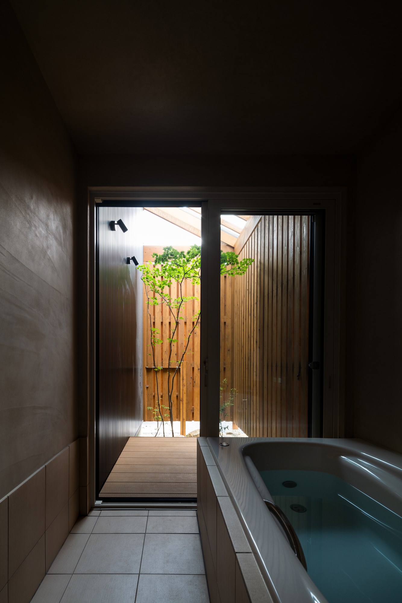 旅を愛し、各地の温泉宿に身をゆだねてきた建主が、日常のなかにもその余韻を持ち帰りたいと望んだことから、この住まいは始まりました。浴室は既製の枠を離れ、外へと連続する半屋外空間へとほどけていきます。湯気の向こうに空気や光、風の気配が重なり、室内にいながらどこか遠くへ来たような感覚をもたらします。